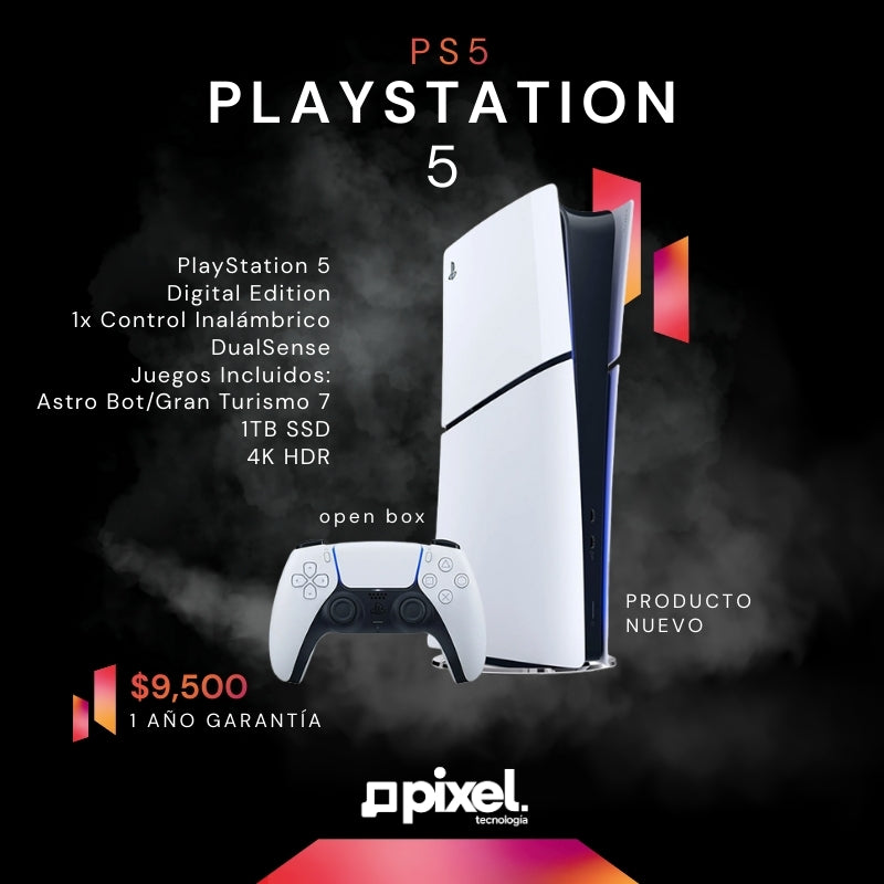 PlayStation 5 Digital Edition ofrece una experiencia de juego de nueva generación con almacenamiento SSD ultrarrápido y gráficos en hasta 4K HDR. Esta versión es completamente digital, ideal para quienes prefieren descargar sus juegos directamente desde la tienda en línea. Incluye dos títulos digitales para comenzar a jugar desde el primer día.
