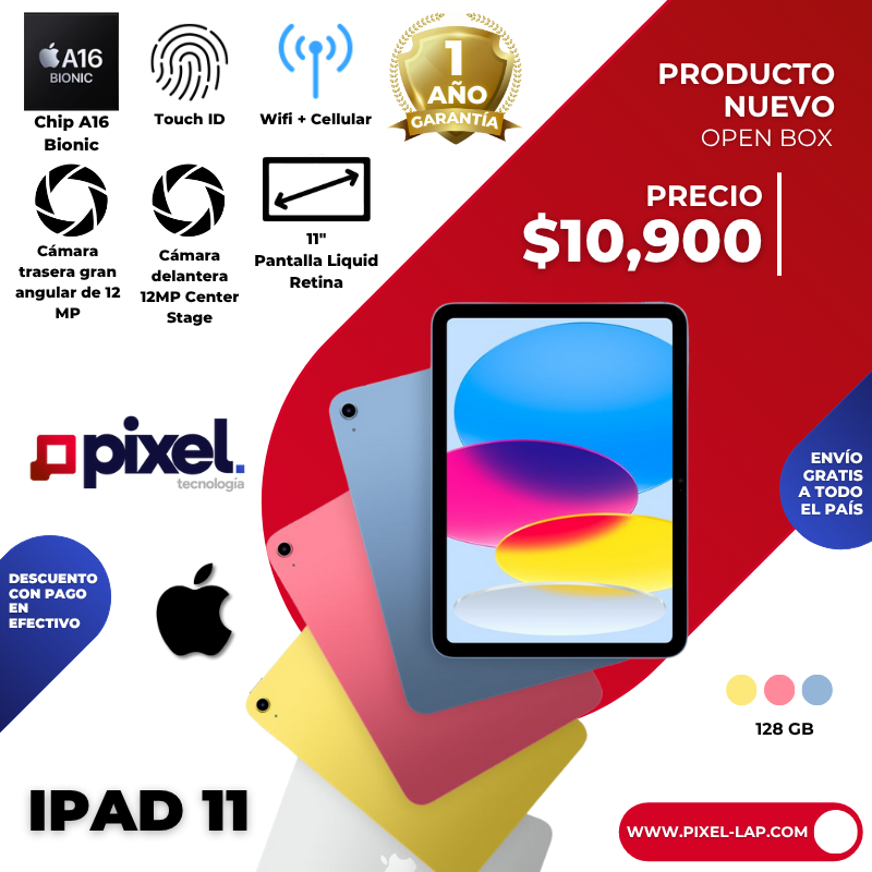 El iPad 11” con chip A16 Bionic ofrece un rendimiento de última generación para estudio, trabajo, diseño, entretenimiento y videollamadas, incluso fuera de casa gracias a su conectividad Wi-Fi + Cellular. Su pantalla Liquid Retina de 11” brinda imágenes vibrantes y fluidas, mientras que sus cámaras de 12 MP con Center Stage aseguran videollamadas claras y bien encuadradas. Todo esto en un diseño portátil, ágil y seguro con Touch ID. 🌐🎨